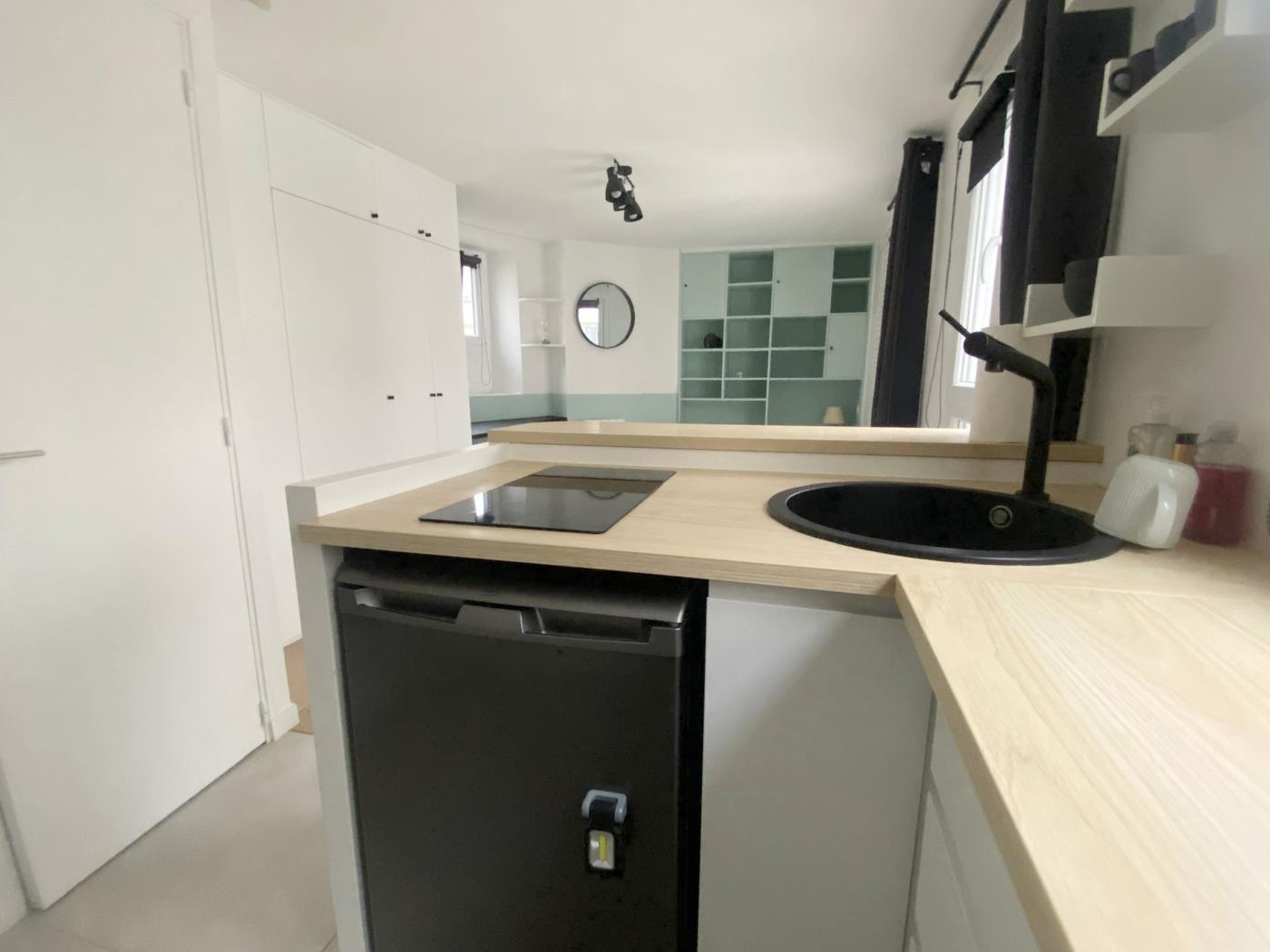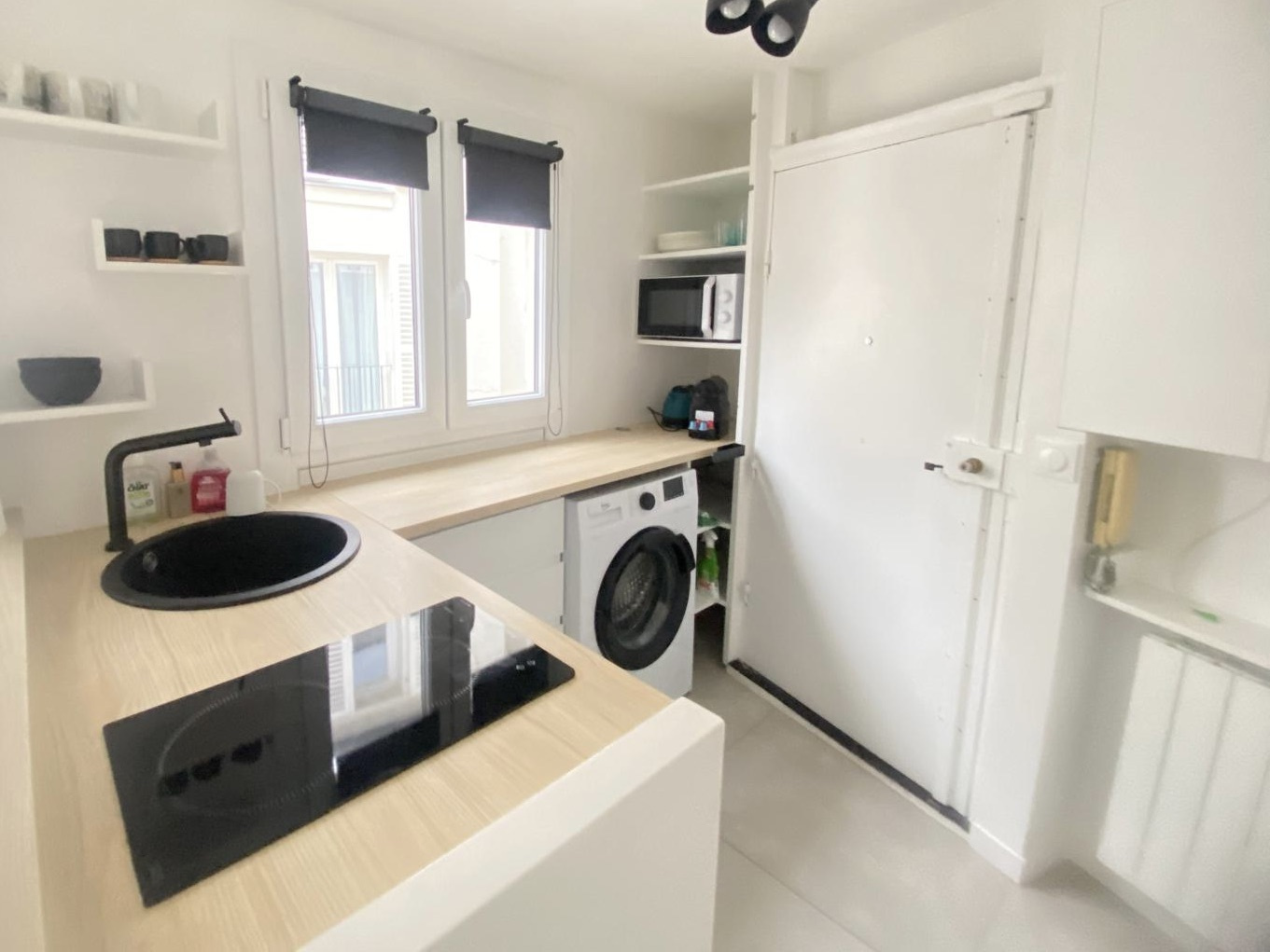 une entrée avec kitchenette moderne et entièrement équipée (machine à laver incluse),