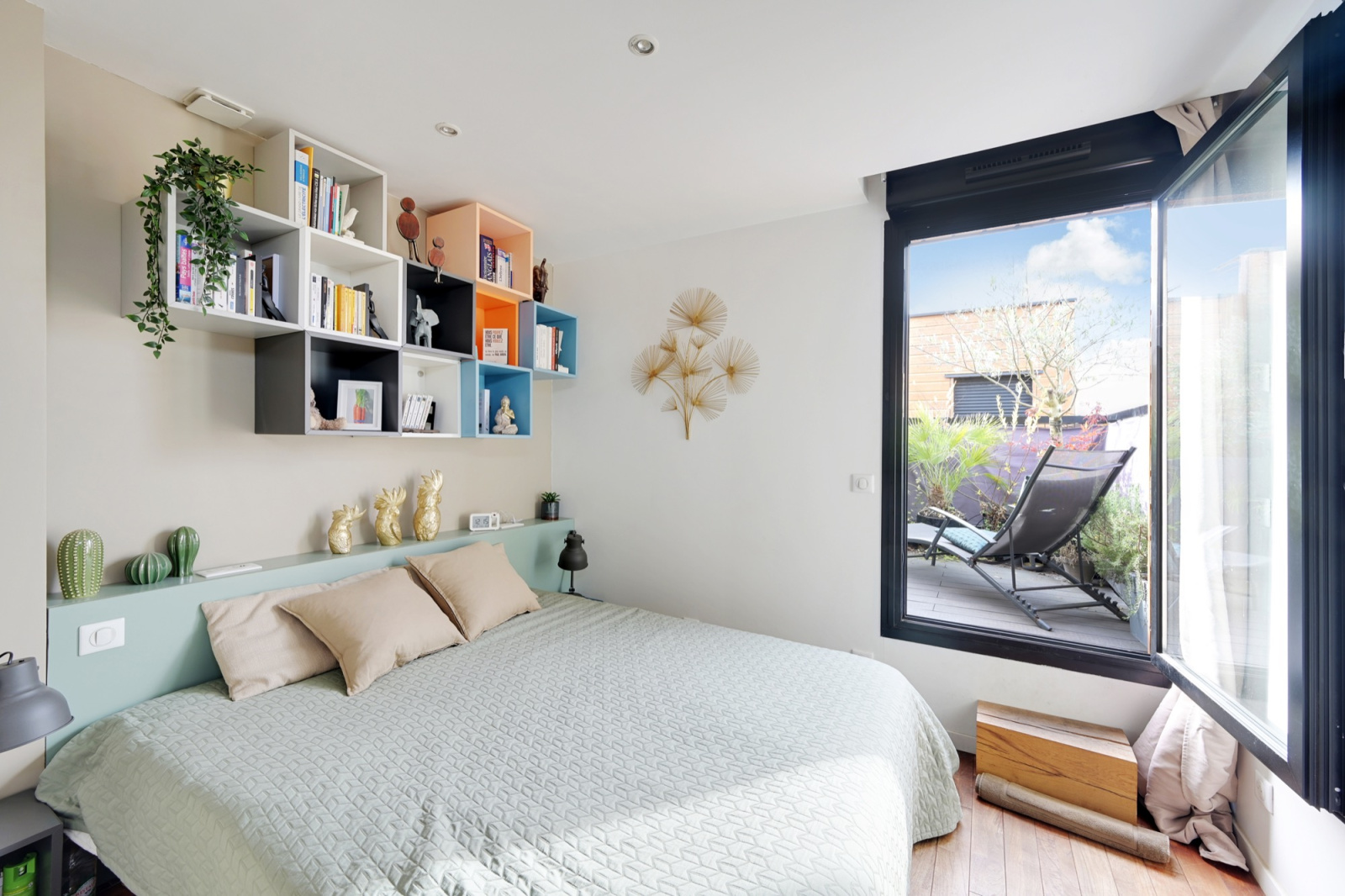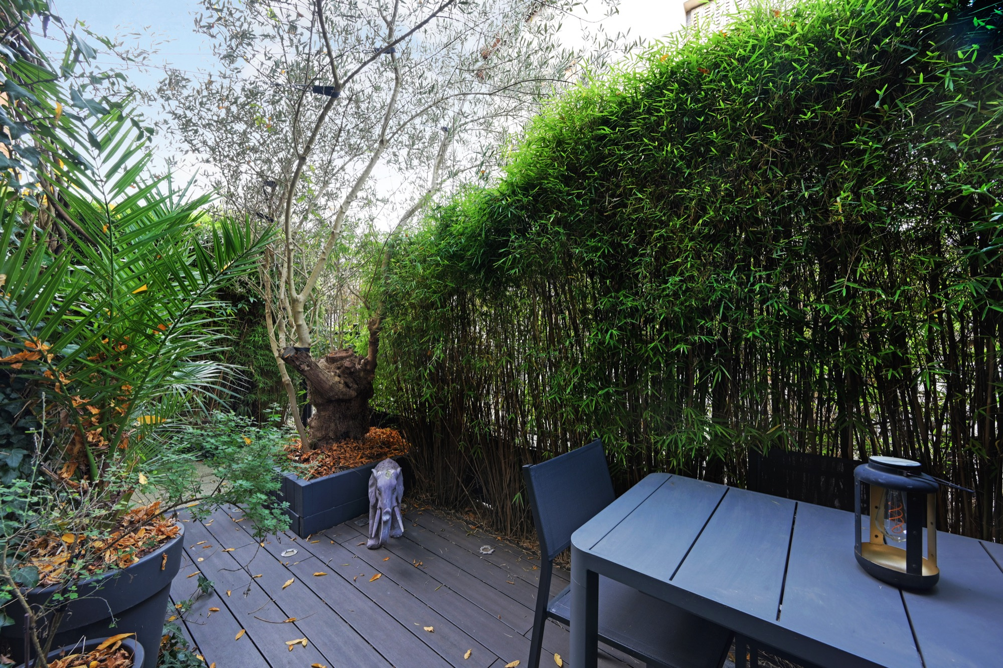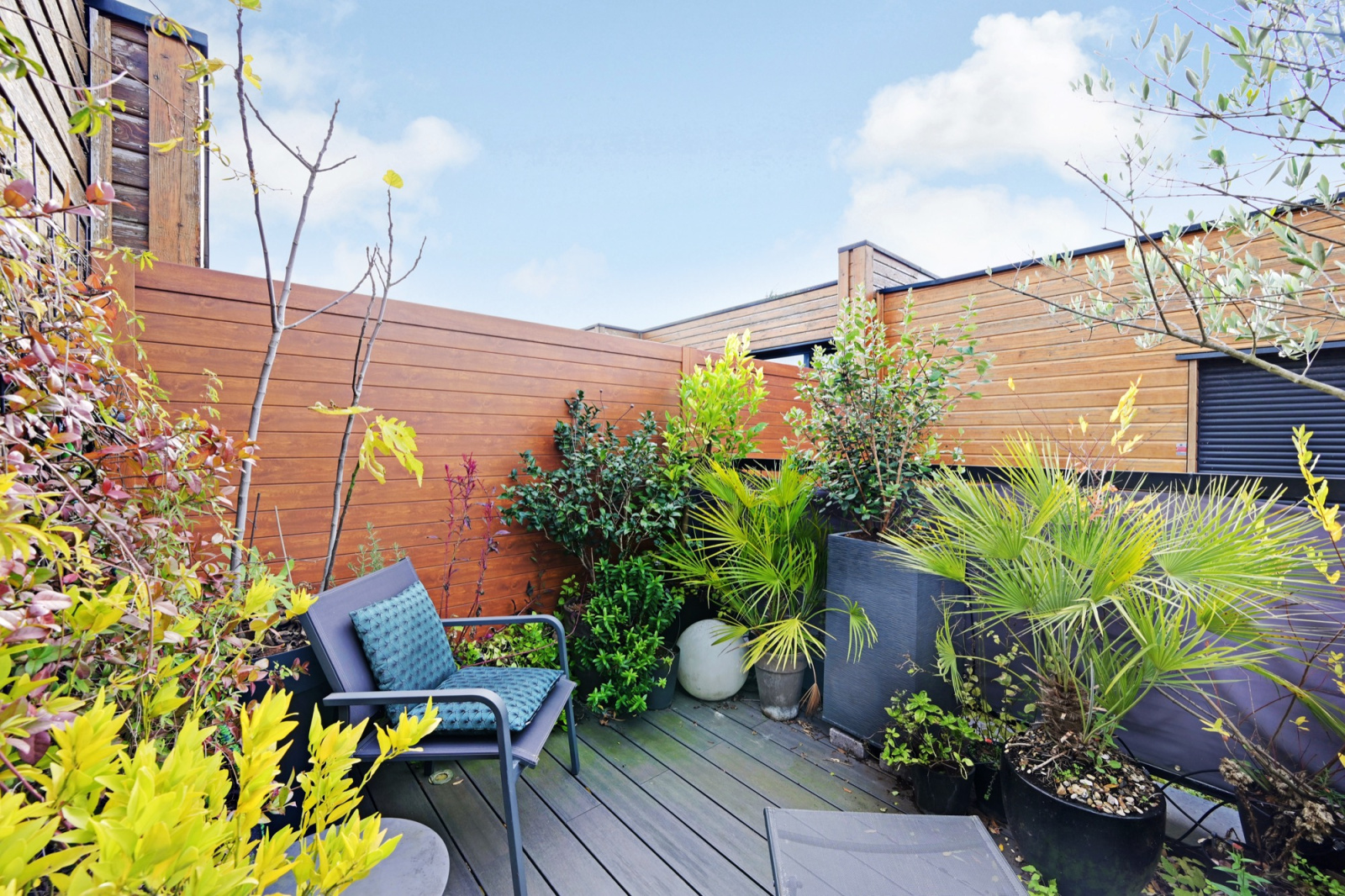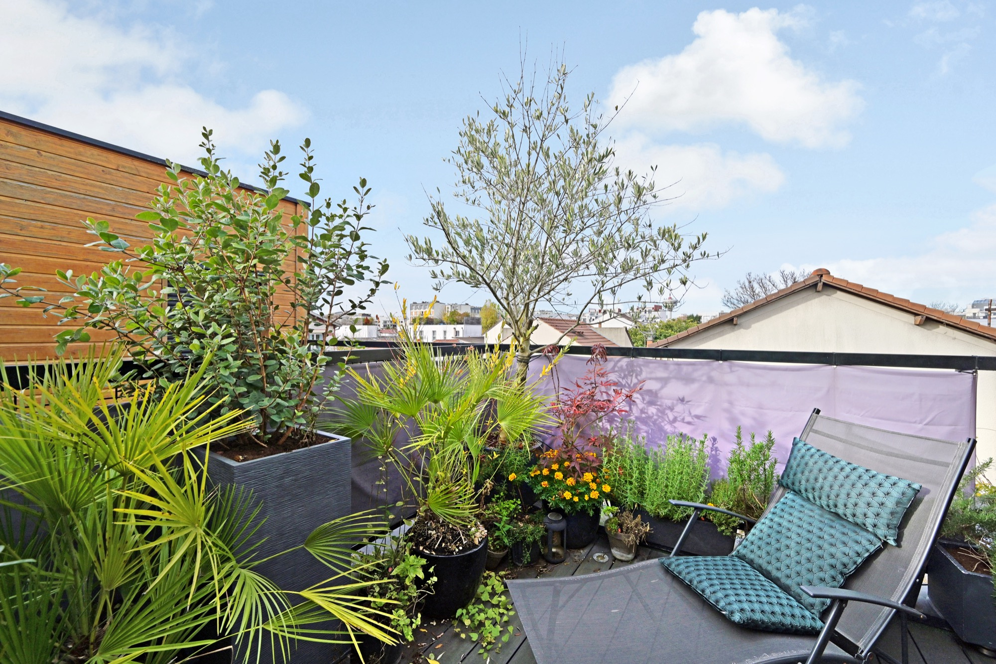 Au dernier niveau, une agréable terrasse solarium offre un espace extérieur intime et ensoleillé, parfait pour se détendre aux beaux jours.