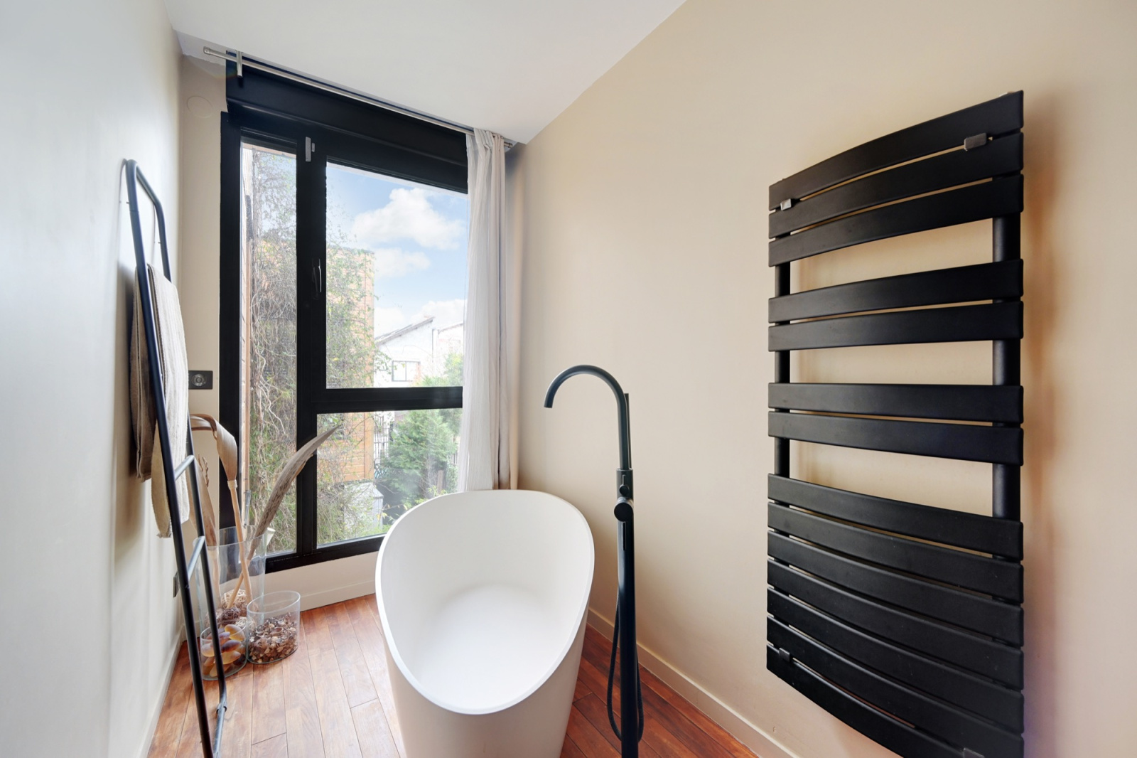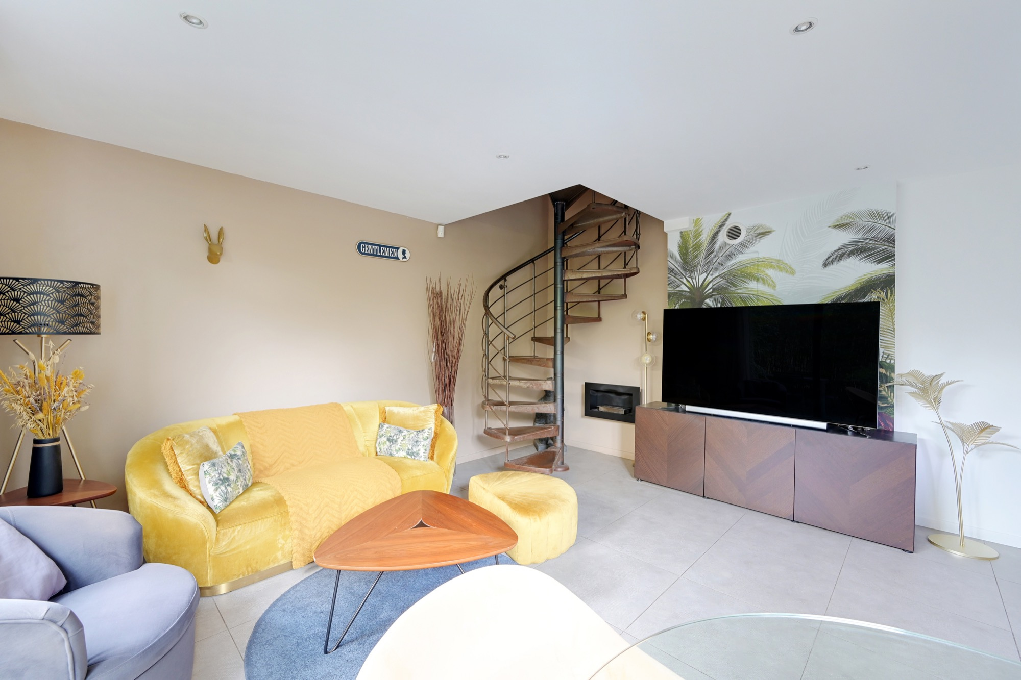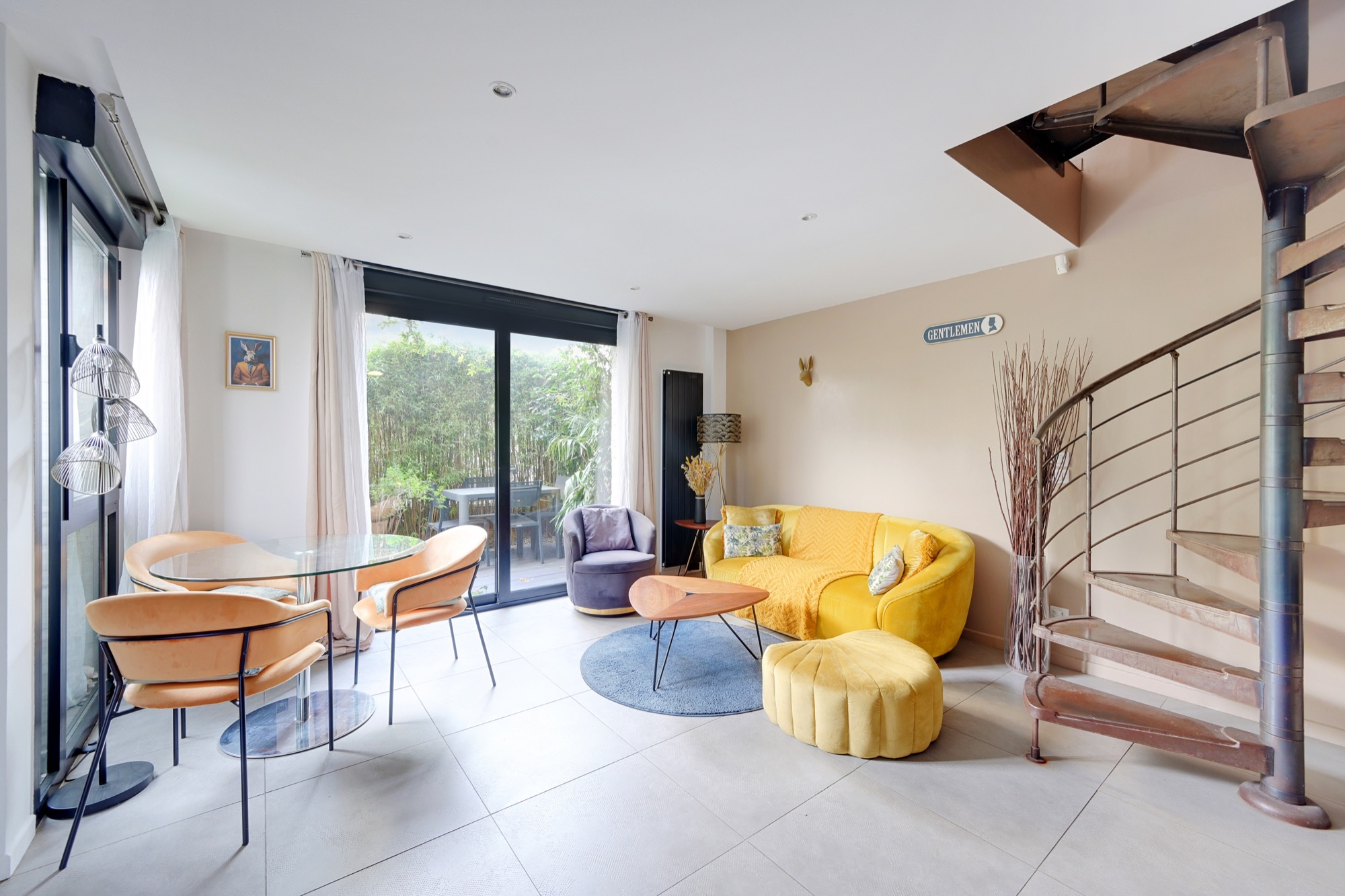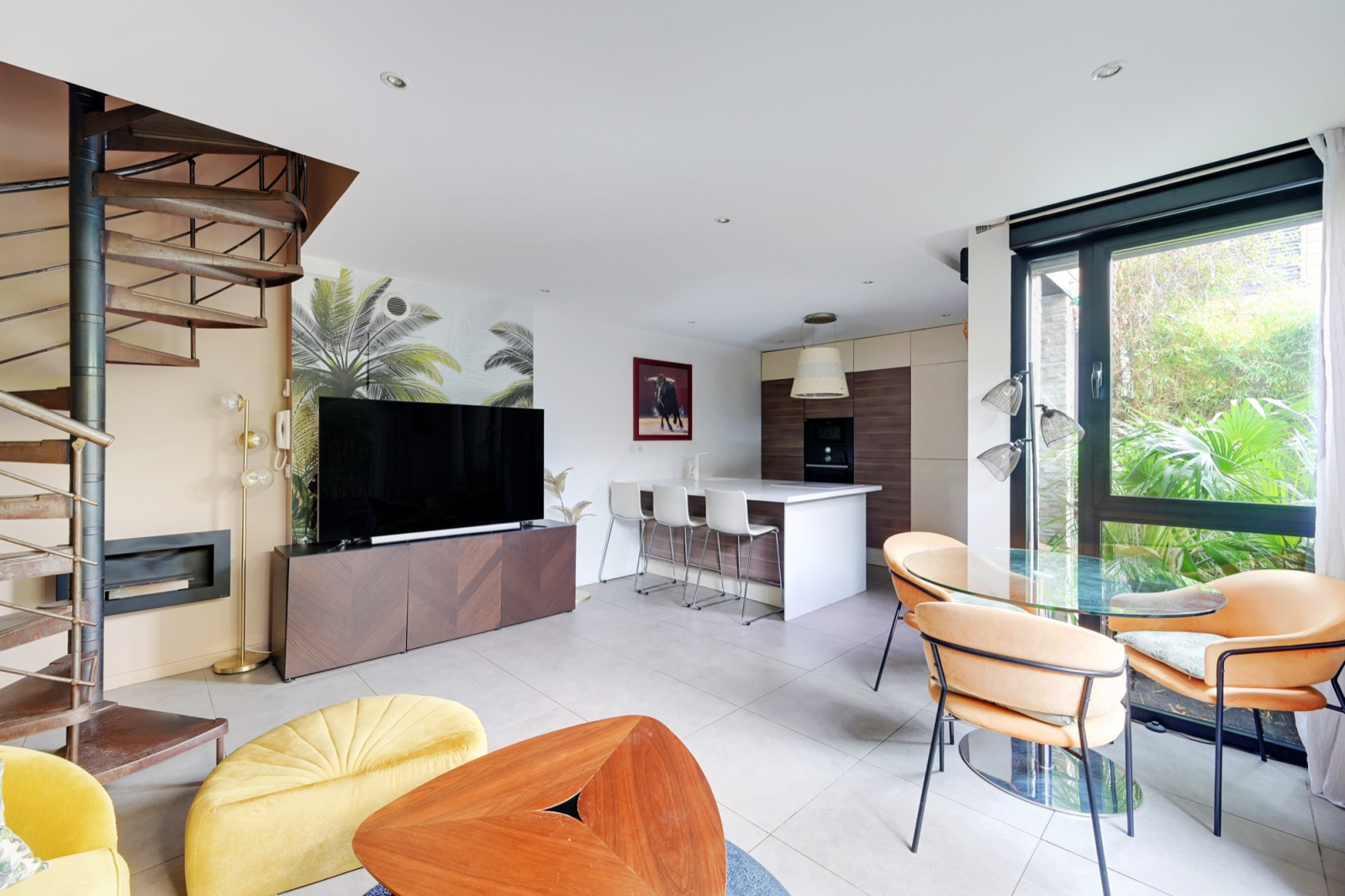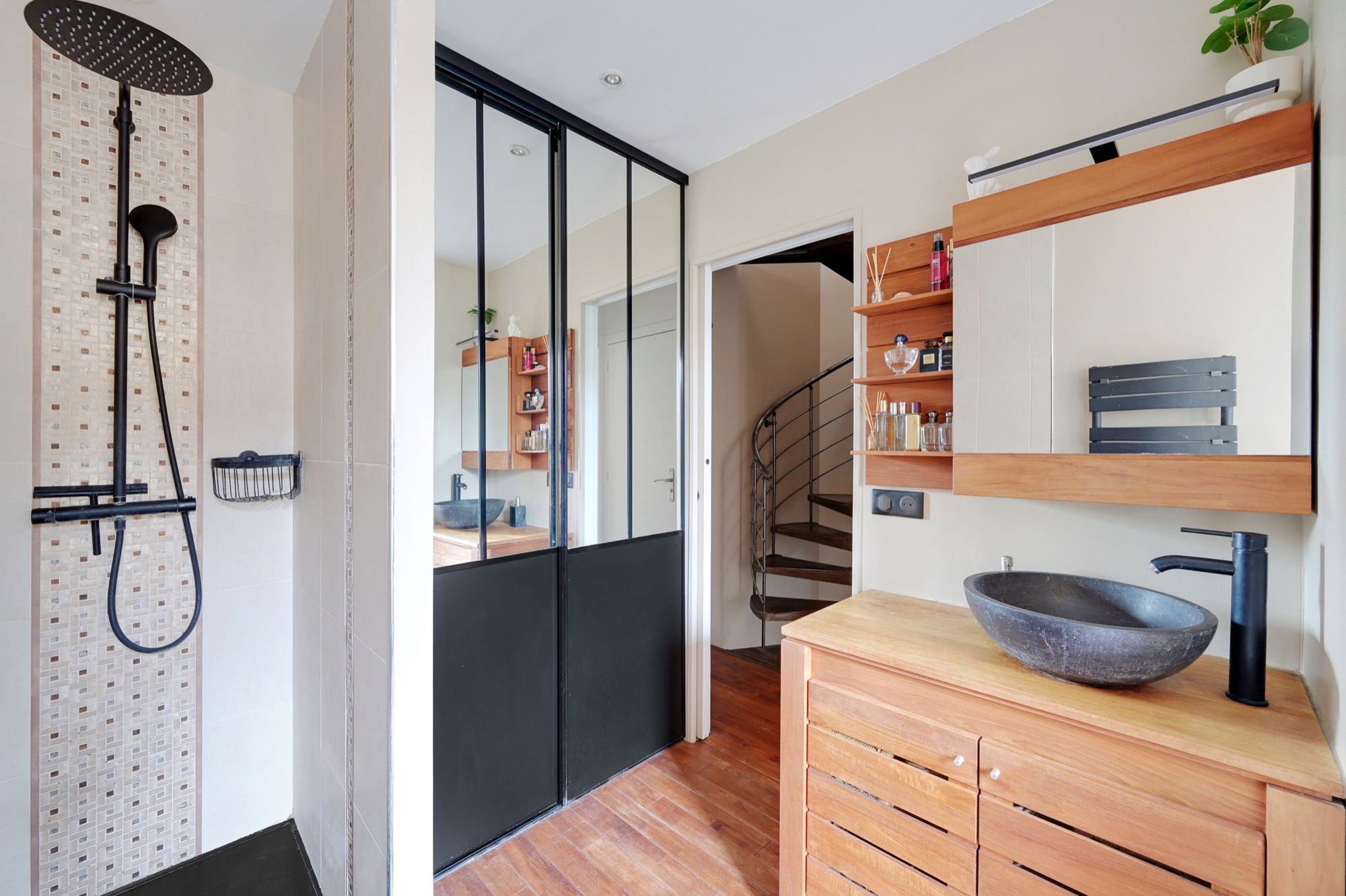 Un escalier hélicoïdal au design élégant mène aux étages supérieurs où se trouvent une chambre principale, une deuxième pièce pouvant servir de bureau ou de chambre d’appoint, ainsi qu’une belle salle de bains et des toilettes indépendantes. L’ensemble est en parfait état et bénéficie de prestations soignées.